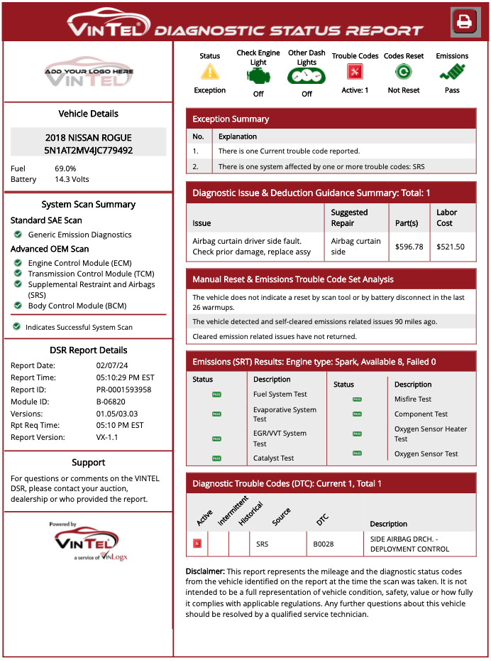 The Diagnostic Status Report is the intelligence output of every VINTEL® scan. It translates complex real-time vehicle behavior into an easy-to-read diagnostic risk profile that exposes early-stage failures, abnormal component stress, and operational patterns linked to costly breakdowns — even when no warning lights or stored fault codes exist. This allows buyers to avoid problem vehicles, reduce recon surprises, and protect profit with confidence.